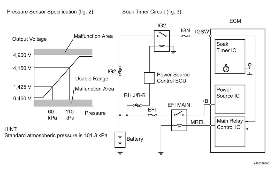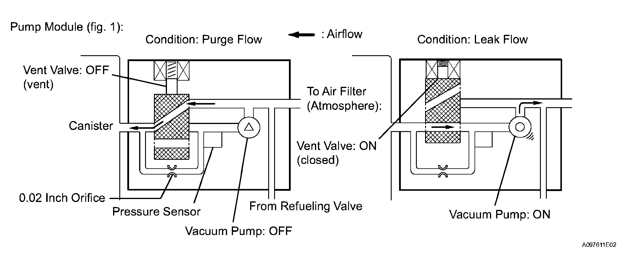 COMPONENT OPERATIONComponent Operation Canister Contains activated charcoal to absorb EVAP generated in fuel tank. Cut-off valve Located in fuel tank. Valve floats and closes when fuel tank 100% full. EVAP VSV (Vacuum Switching Valve) Opens or closes line between canister and intake manifold. ECM uses EVAP VSV to control EVAP purge flow. In order to discharge EVAP absorbed by canister to intake manifold, ECM opens EVAP VSV. EVAP discharge volume to intake manifold controlled by EVAP VSV duty cycle ratio (currentcarrying time) (open: ON, close: OFF). Refueling valve Controls EVAP pressure from fuel tank to canister. Valve consists of diaphragm, spring and restrictor (diameter: 0.08 inch). When fuel vapor and pressure inside fuel tank increase, valve opens. While EVAP purged, valve closes and restrictor prevents a large amount of vacuum from affecting pressure in fuel tank. Valve opens while refueling. Roll-over valve Located in fuel tank. Valve closes by its own weight when vehicle overturns to prevent fuel from spilling out. Soak timer Built into ECM. To ensure accurate EVAP monitor, measures 5 hours (+-15 min) after engine switch off. This allows fuel to cool down, stabilizing Fuel Tank Pressure (FTP). When approximately 5 hours elapsed, ECM activates. Pump module Consists of (a) to (d) below. Pump module cannot be disassembled. (a) Vent valve Vents and closes EVAP system. When ECM turns valve ON, EVAP system closed. When, ECM turns valve OFF, EVAP system vented. Negative pressure (vacuum) created in EVAP system to check for EVAP leaks by closing EVAP VSV, turning vent valve ON (closed) and operating vacuum pump (refer to Fig 4). (b) Pressure sensor Indicates pressure as voltage. ECM supplies regulated 5 V to pressure sensor, and uses feedback from sensor to monitor EVAP system pressure (refer to Fig 5). (c) Vacuum pump Creates negative pressure (vacuum) in EVAP system for leak check. (d) 0.02 inch orifice Has opening with 0.02 inch diameter. Vacuum produced through orifice by closing EVAP VSV, turning vent valve OFF and operating vacuum pump, to monitor 0.02 inch leak pressure. 0.02 inch leak pressure indicates small leak of EVAP. - The 1st monitor