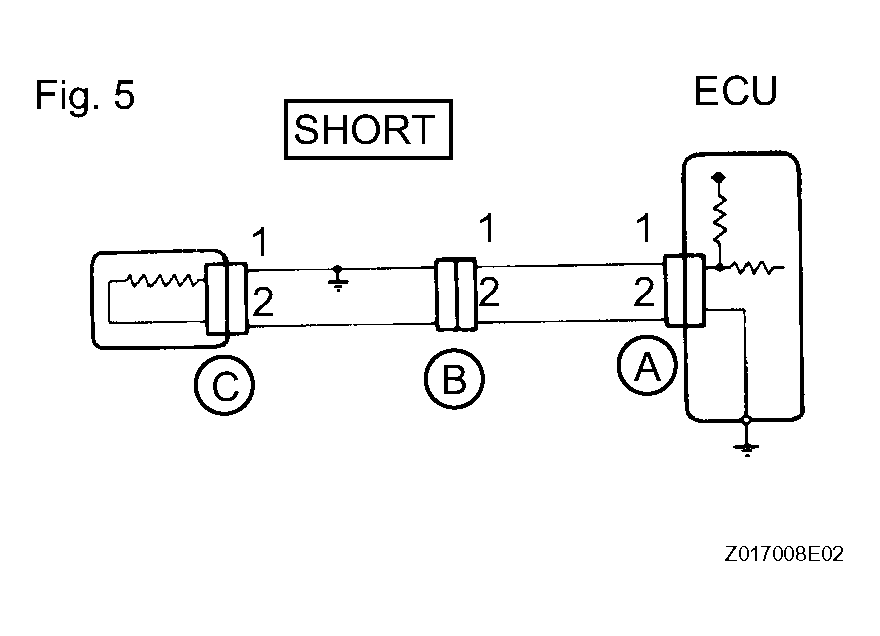 TESTER CONNECTION AND SPECIFIED CONDITIONTester Connection Specified Condition Connector A terminal 1 - Body ground 5 V Connector B terminal 1 - Body ground 5 V Connector C terminal 1 - Body ground Below 1 V If the results match the examples above, an open circuit exists in the wire harness between terminal 1 of connector B and terminal 1 of connector C.