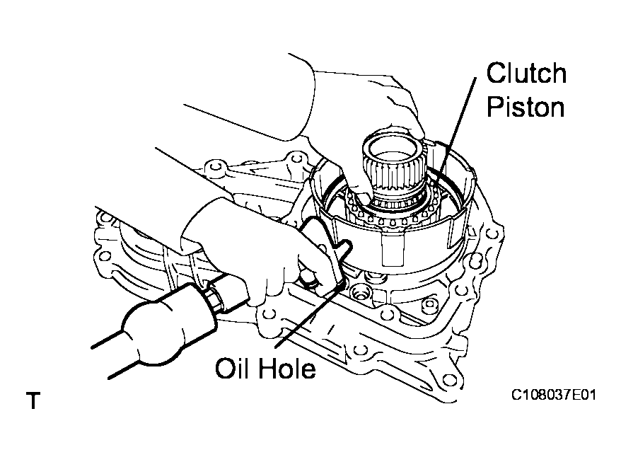 - While pushing down evenly on the center differential clutch piston, apply air (200 kpa, 2.0 kgf*cm2, 19 psi) into the oil hole on the transfer chain case rear as shown in Fig 31 to remove the center differential clutch piston from the transfer direct clutch drum.