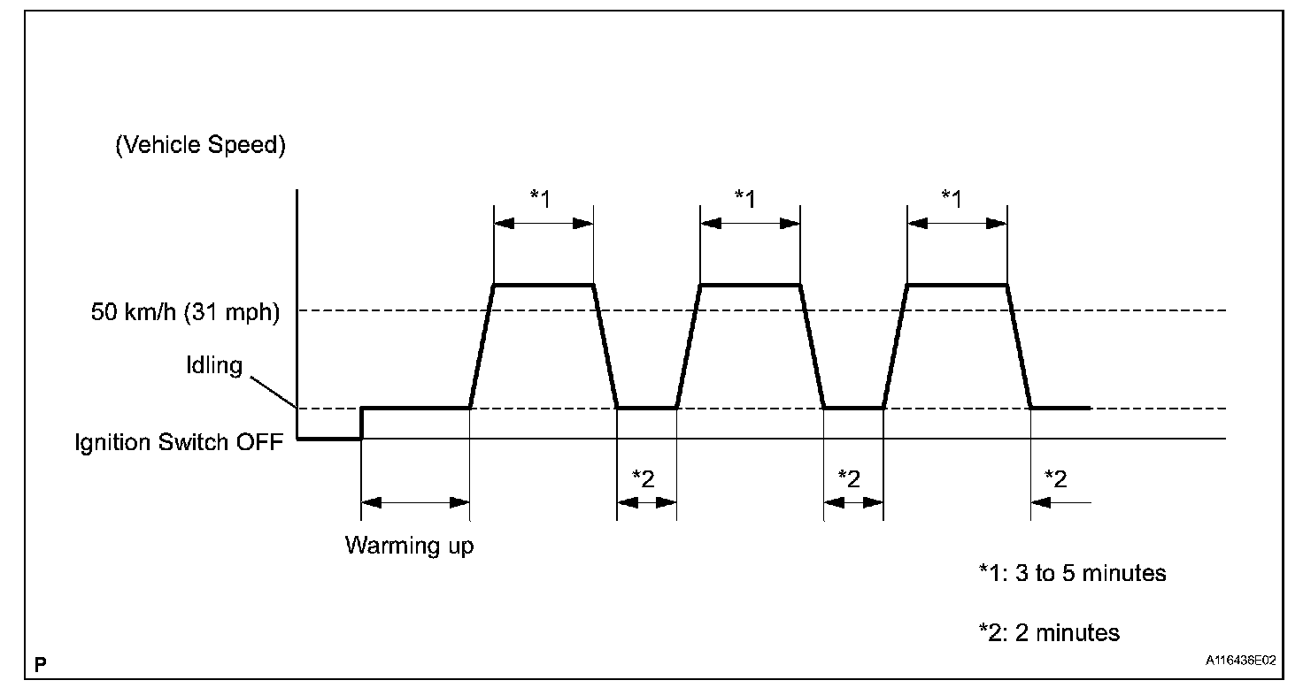6. Drive the vehicle at 50 km/h (31 mph) or more for 3 to 5 minutes (*1).