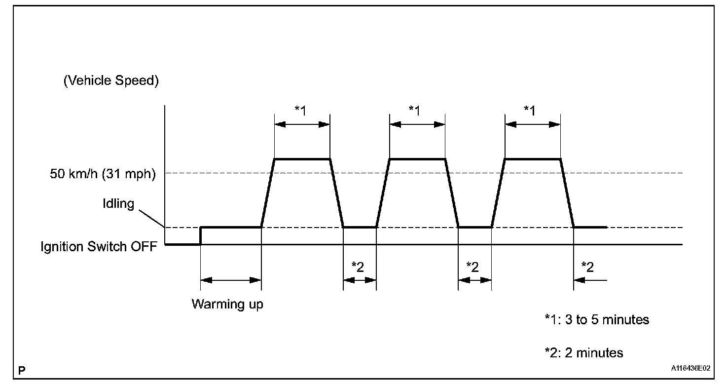 6. Drive the vehicle at 50 km/h (31 mph) or more for 3 to 5 minutes (*1).