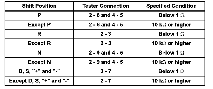 If the resistance value is not as specified, replace the park/neutral position switch assembly.