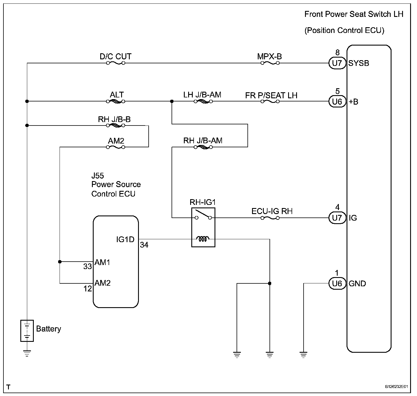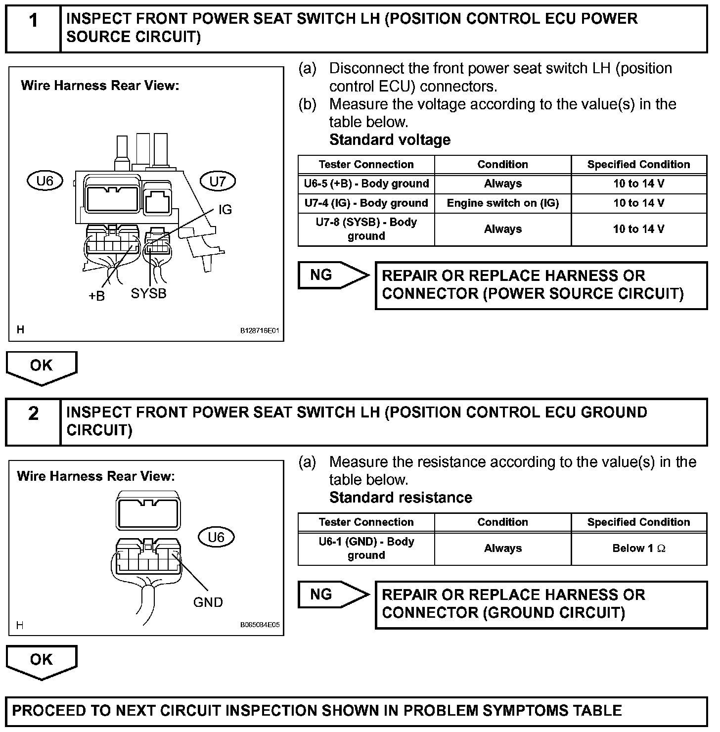 HINT: Manual adjustment of the slide, reclining, or lumbar can be performed even when the front power seat switch LH is not functional if current is allowed to flow into terminals +B and SYSB.