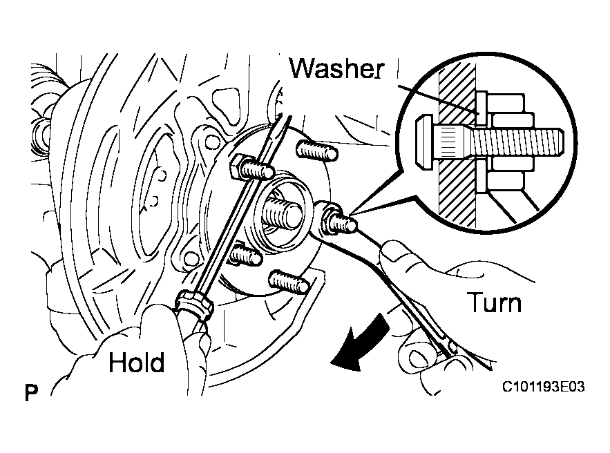 - Using a screwdriver or equivalent to hold the hub, turn the wheel nut to pull the hub bolt until the bottom surface of the hub bolt head touches the axle hub.