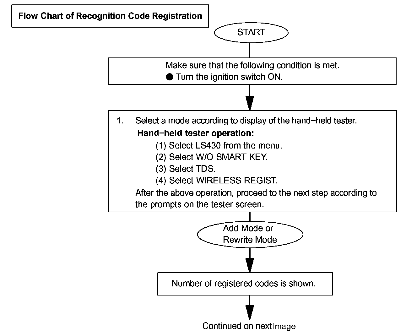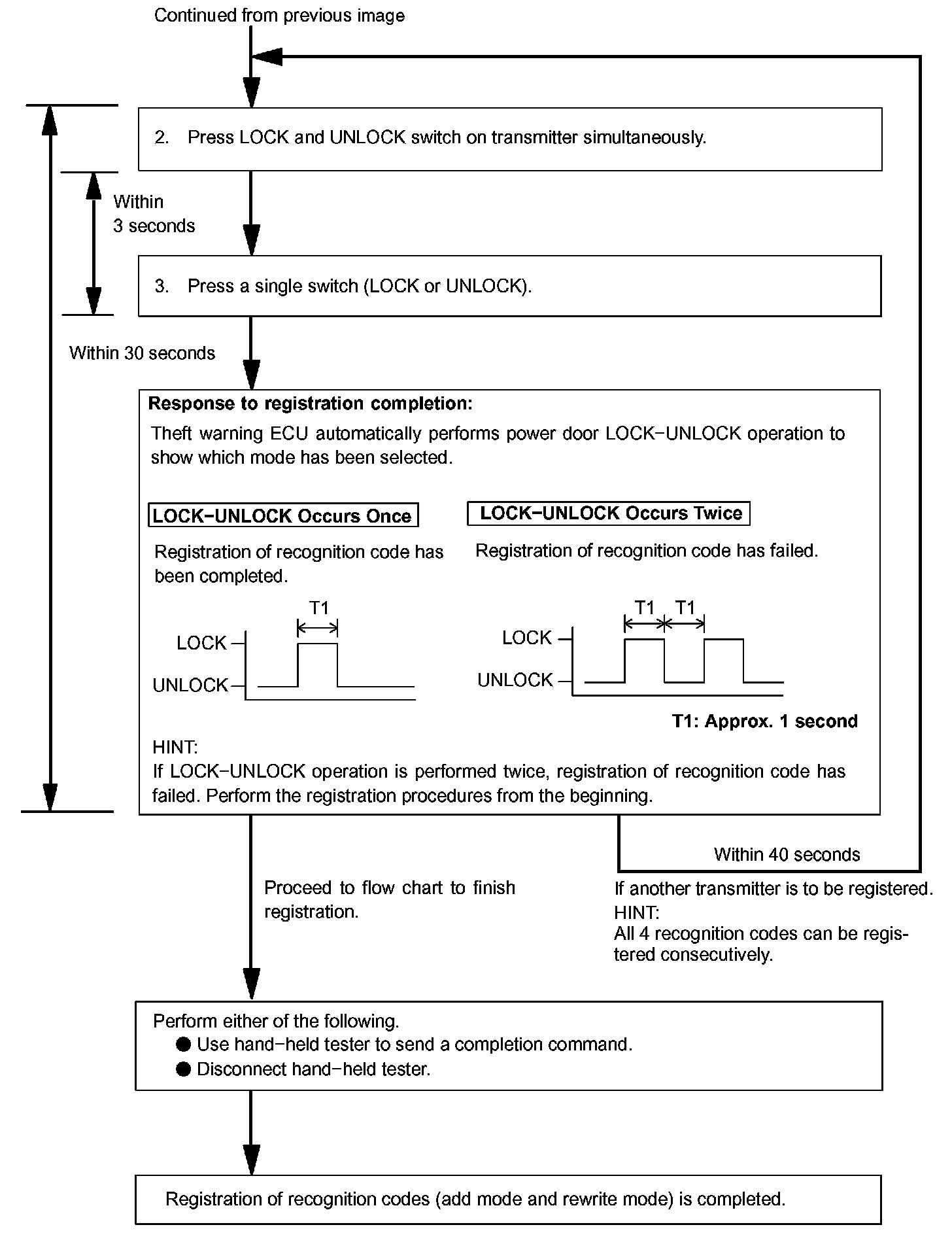 - Add mode is used to register new recognition codes while still retaining codes already registered. This mode is used when a new transmitter is added. If the number of registered codes exceeds 4, the previously registered codes will be erased, starting from the first registered code.