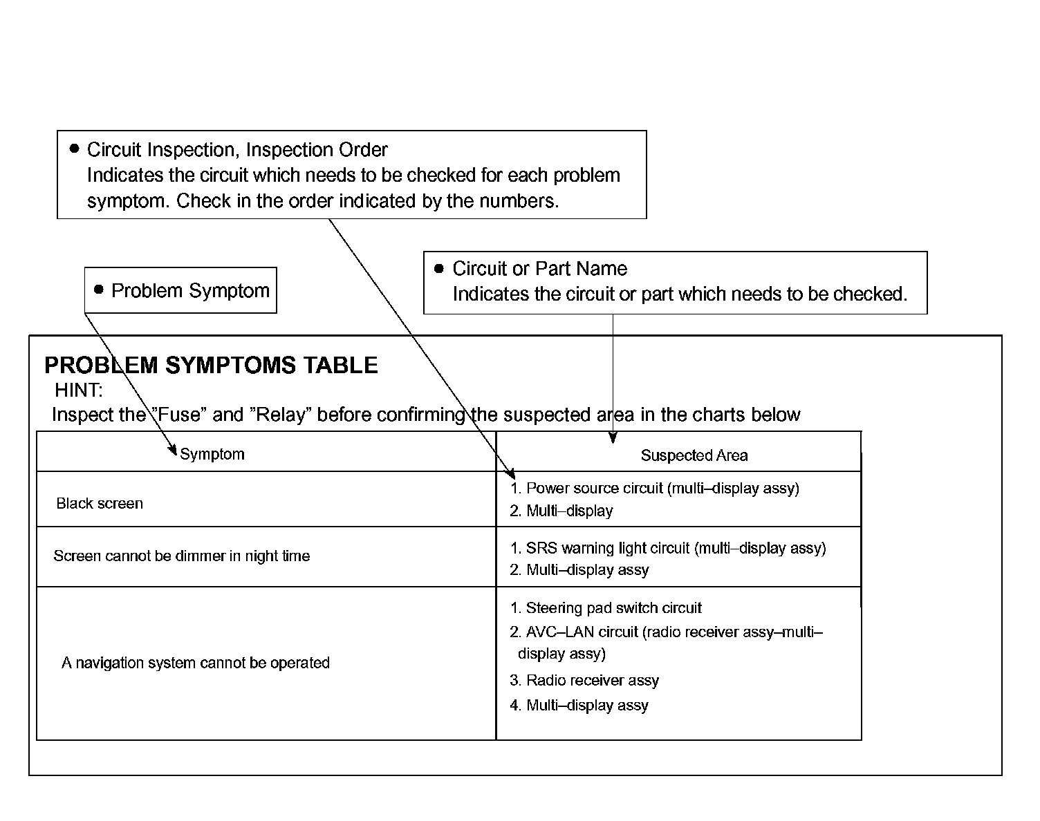 The suspected circuits or parts for each problem symptom are shown in the table. Use this table to troubleshoot when, during a DTC check, a "Normal" code is displayed but the problem is still occurring. Numbers in the table show the inspection order in which the circuits or parts should be checked.