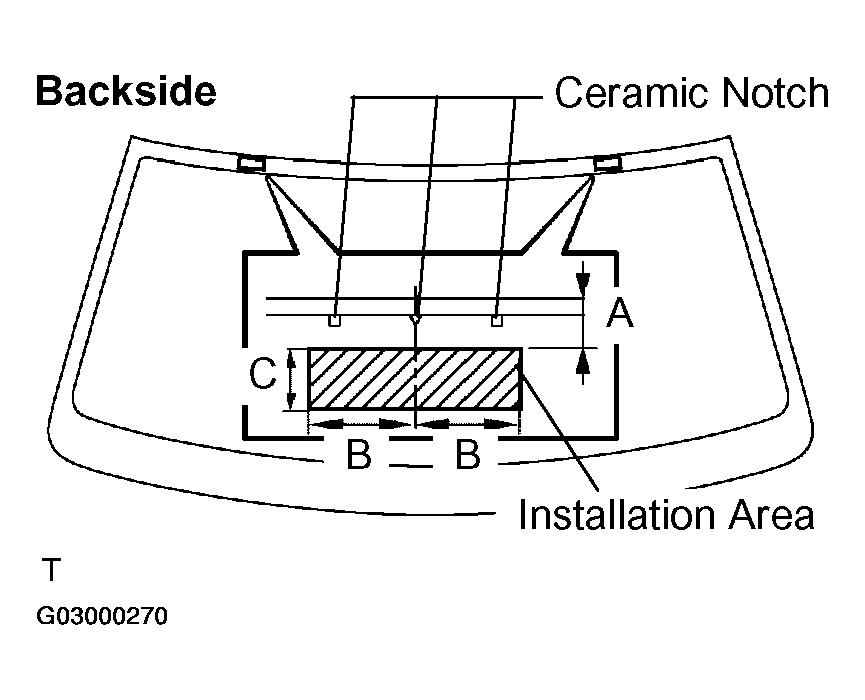 WINDSHIELD GLASS STOPPER NO. 2Area Measurement A 12.4 mm (0.488 in.) B 40.0 mm (1.574 in.) C 12.5 mm (0.492 in.) - Coat the installation part of the stoppers with Primer G.