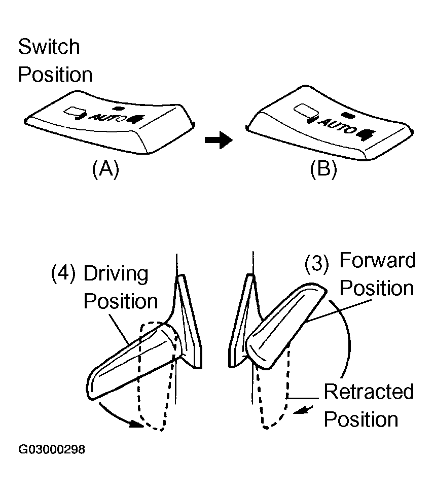 - Perform the above step again. This time, before the mirror operation finishes, turn the ignition switch to ACC and press the retract switch. Check that the mirror operates in the opposite direction.