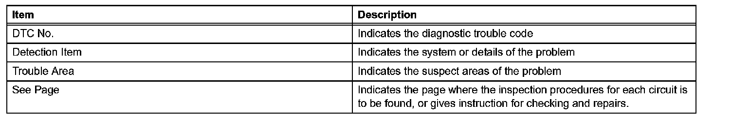 DIAGNOSTIC TROUBLE CODE CHARTLook for output Diagnostic Trouble Codes (DTCs) (from the DTC checks) in the appropriate section's Diagnostic Trouble Code Chart. Use the chart to determine the trouble area and the proper inspection procedure. A description of each of the chart's columns are as mentioned.