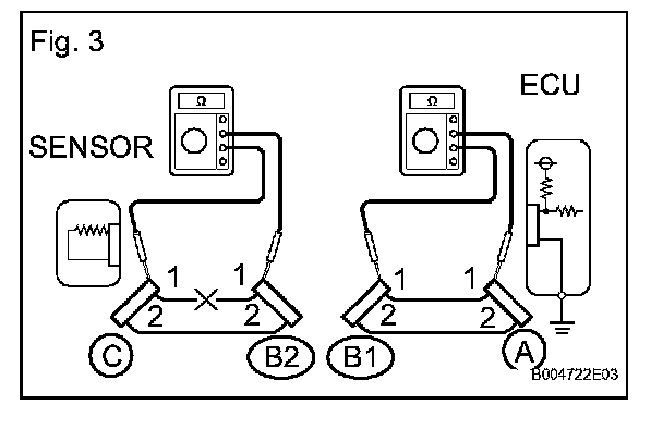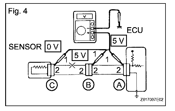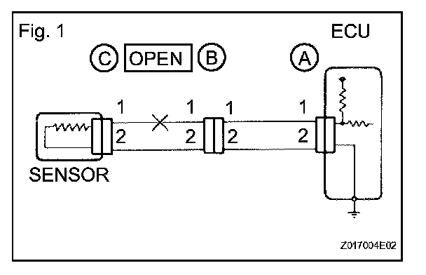 a. For an open circuit in the wire harness in Fig. 1, check the resistance or voltage, as described.