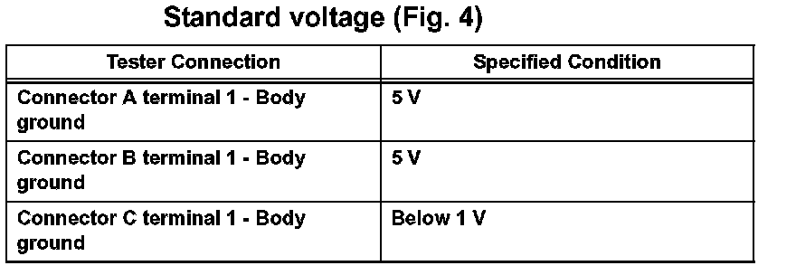 With each connector still connected, measure the voltage between the body ground and these terminals (in this order): 1) terminal 1 of connector A, 2) terminal 1 of connector B, and 3) terminal 1 of connector C.