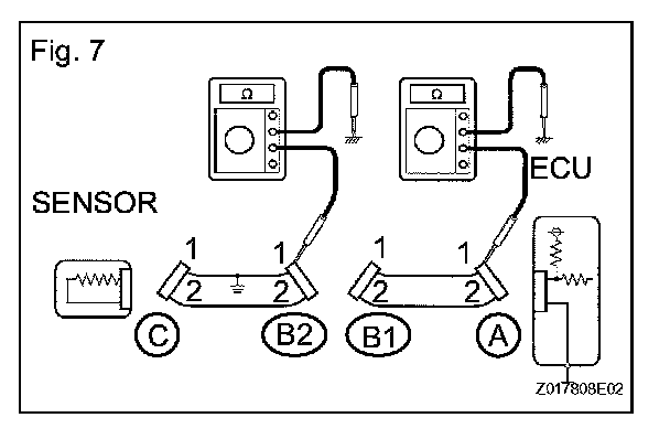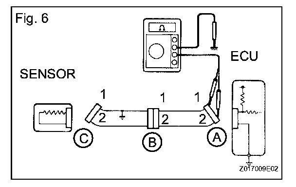 HINT: Measure the resistance while lightly shaking the wire harness vertically and horizontally. If your results match the examples above, a short circuit exists between terminal 1 of connector A and terminal 1 of connector C.