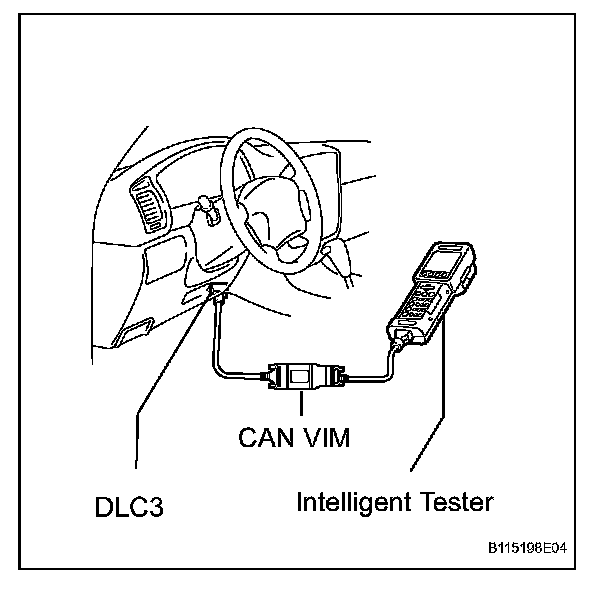 Connect the cable of the intelligent tester (with CAN VIM) to the DLC3, turn the ignition switch ON and attempt to use the tester. If the display indicates that a communication error has occurred, there is a problem either with the vehicle or with the tester.