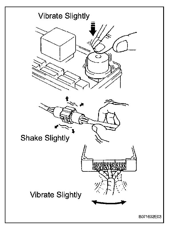 With a problem that only occurs when the engine is cold or as a result of vibration caused by the road during driving, the problem can never be determined if the symptoms are being checked on a stationary vehicle or on a vehicle with a warmed up engine. Vibration, heat or water penetration (moisture) is difficult to reproduce. The symptom simulation tests below are effective substitutes for the conditions and can be applied on a stationary vehicle. Important points in the symptom simulation test: