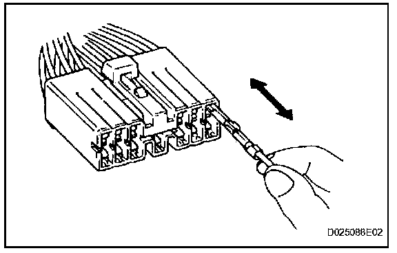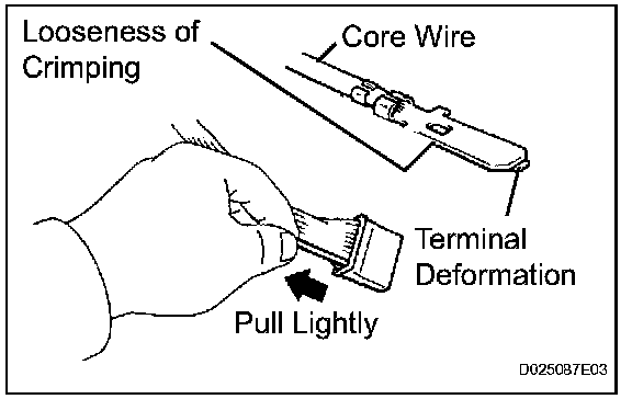 Check by pulling the wire harness lightly from the backside of the connector. Look for unlatched terminals, missing terminals, loose crimps or broken conductor wires. Check visually for corrosion, metallic or foreign matter and water, and bent, rusted, overheated, contaminated, or deformed terminals.