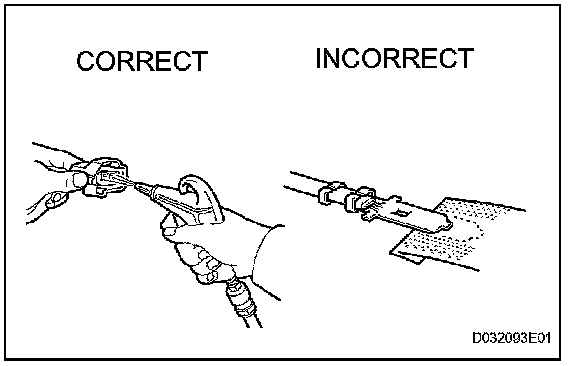 5. If checking a connector with a TOYOTA electrical tester, check the connector from the backside (harness side) using a mini test lead.