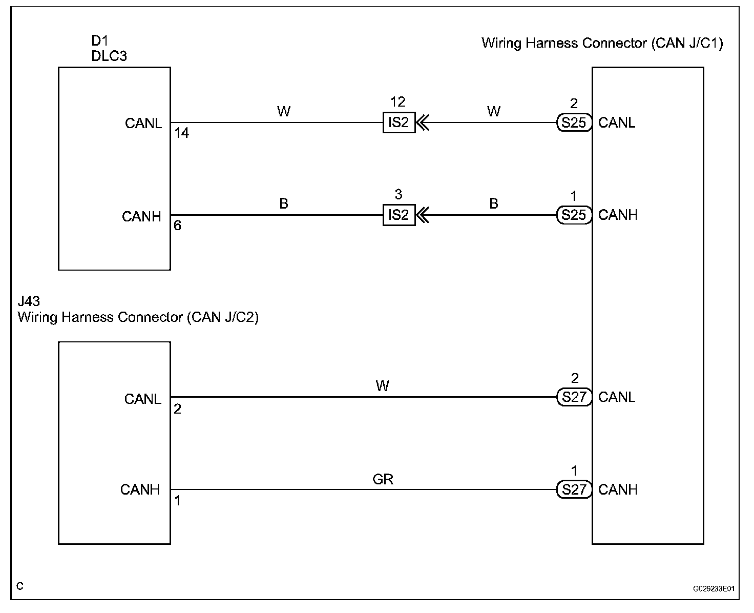 HINT: Identify the connector to be checked by its color of the wire and shape of the junction on the CAN J/C because the locations of the connectors to the CAN J/C are confusing.