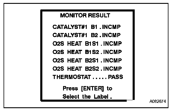 e. Select the intelligent tester menus: DIAGNOSIS, ENHANCED OBDII, MONITOR INFO and MONITOR RESULT. The monitor result appears after the component name.