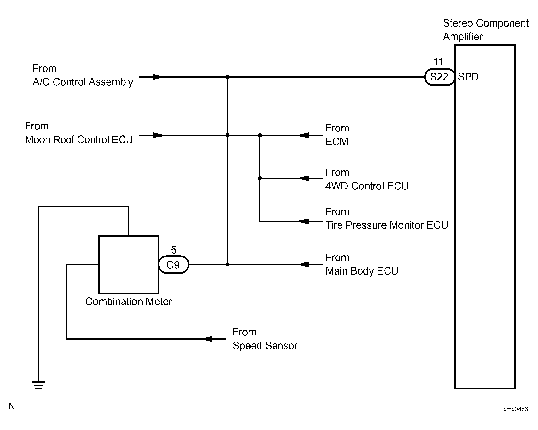 This circuit is necessary for the ASL (Auto Sound Leveliser) built into the stereo component amplifier. Speed signals are received from the combination meter and used for the ASL.