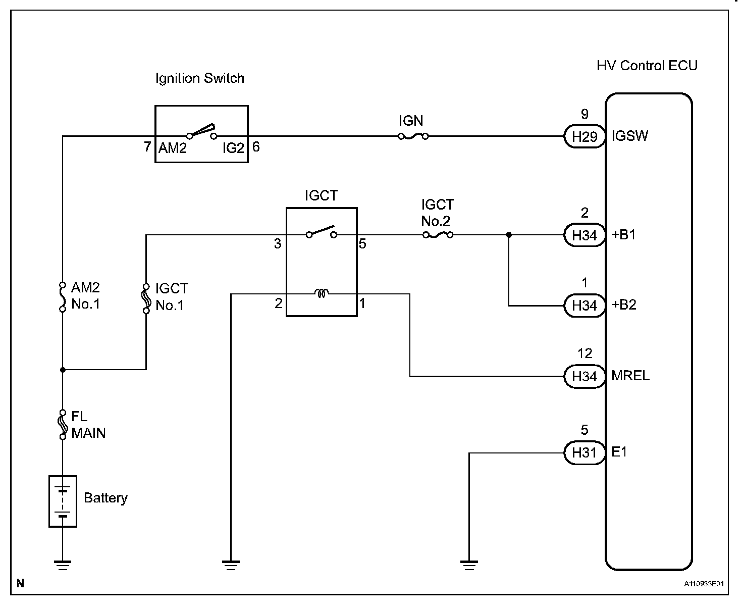 When the engine switch is turned to on, the battery voltage is applied to terminal IGSW of the ECM (Included in HV Control ECU). The ECM MREL output signal causes a current to flow to the coil, closing the contacts of the IGCT relay and supplying power to terminal +B of the ECM.