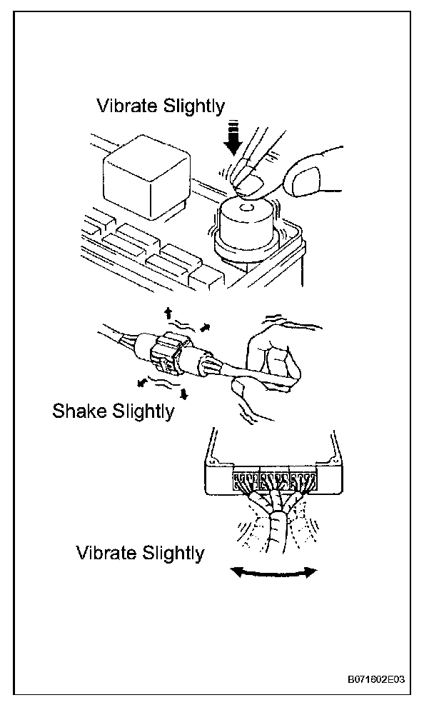 With a problem that only occurs when the engine is cold or as a result of vibration caused by the road during driving, the problem can never be determined if the symptoms are being checked on a stationary vehicle or a vehicle with a warmed-up engine. Vibration, heat or water penetration (moisture) is difficult to reproduce. The symptom simulation tests below are effective substitutes for the conditions and can be applied on a stationary vehicle. Important points in the symptom simulation test:
