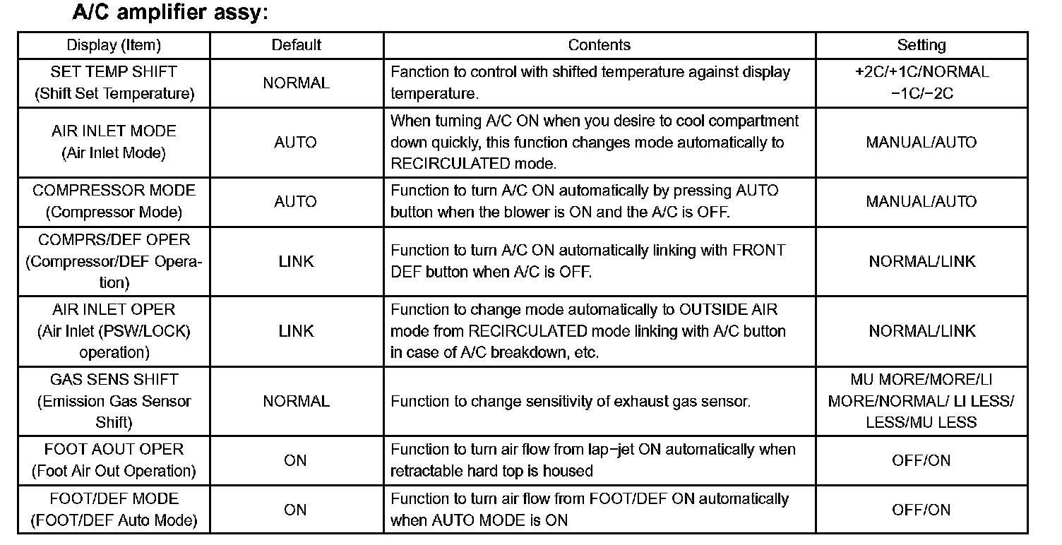 - When troubleshooting a function, first make sure that the function is set to the default setting. A/C amplifier assy.