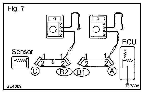 If your results match the examples above, a short circuit exists between terminal 1 of connector B2 and terminal 1 of connector C.
