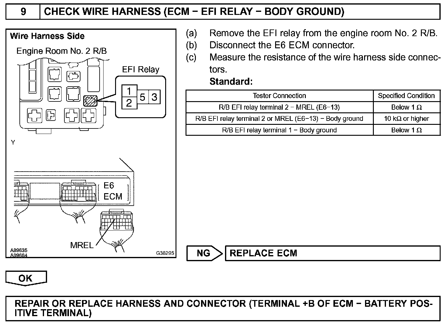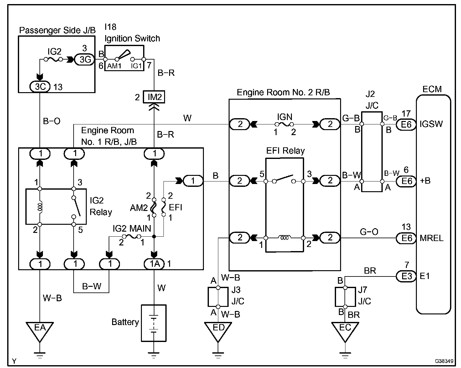 When the ignition switch is turned ON, battery voltage is applied to terminal IGSW of the ECM. The ECM "MREL" output signal causes current to flow to the coil, closing the contacts of the EFI relay and supplying power to terminal +B of the ECM.