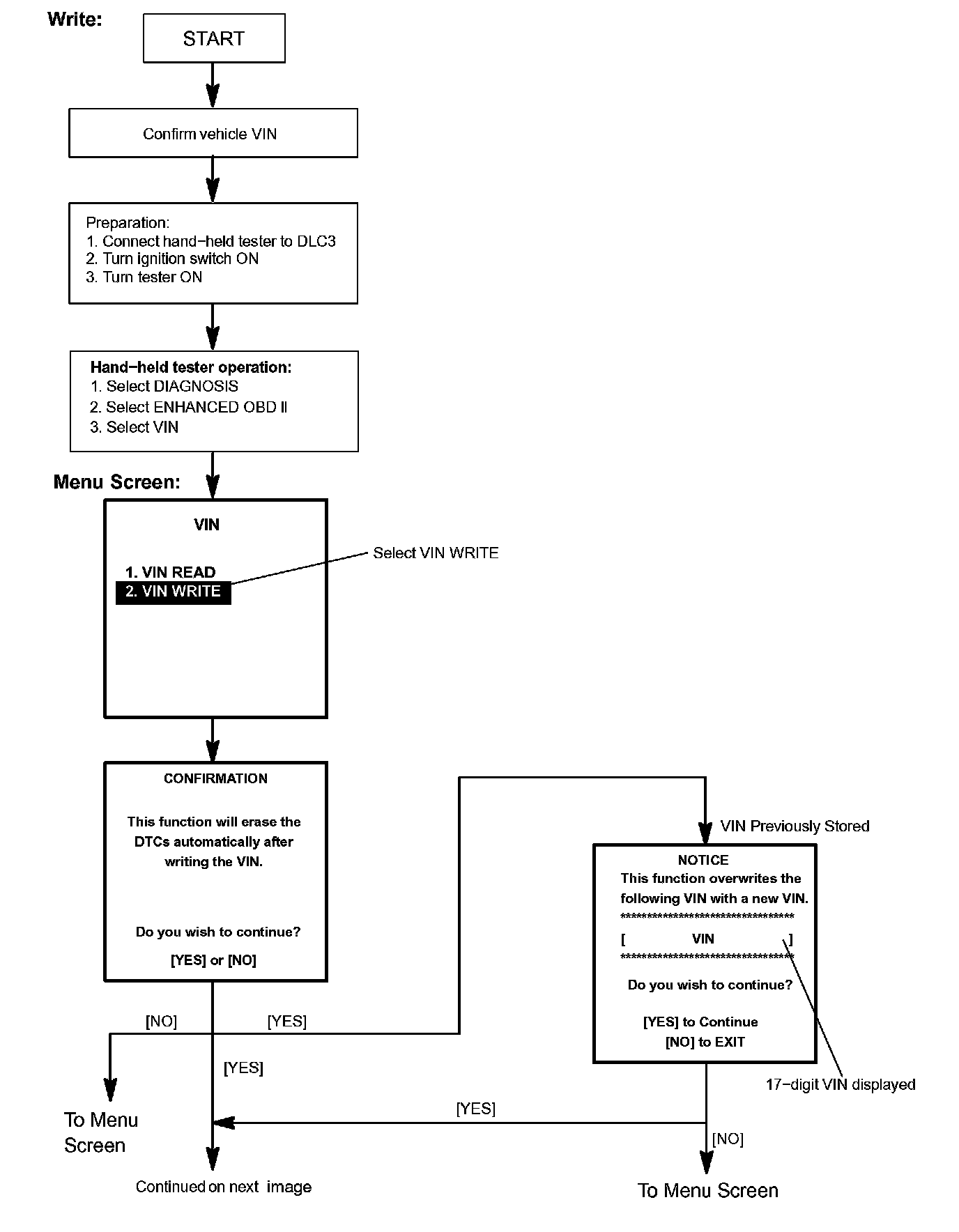 c. Write VIN: Explains the VIN writing process in a flowchart. This process allows the VIN to be input into the ECM. If the ECM is changed, or the VIN and VIN do not match, the VIN can be registered, or overwritten in the ECM by following this procedure.