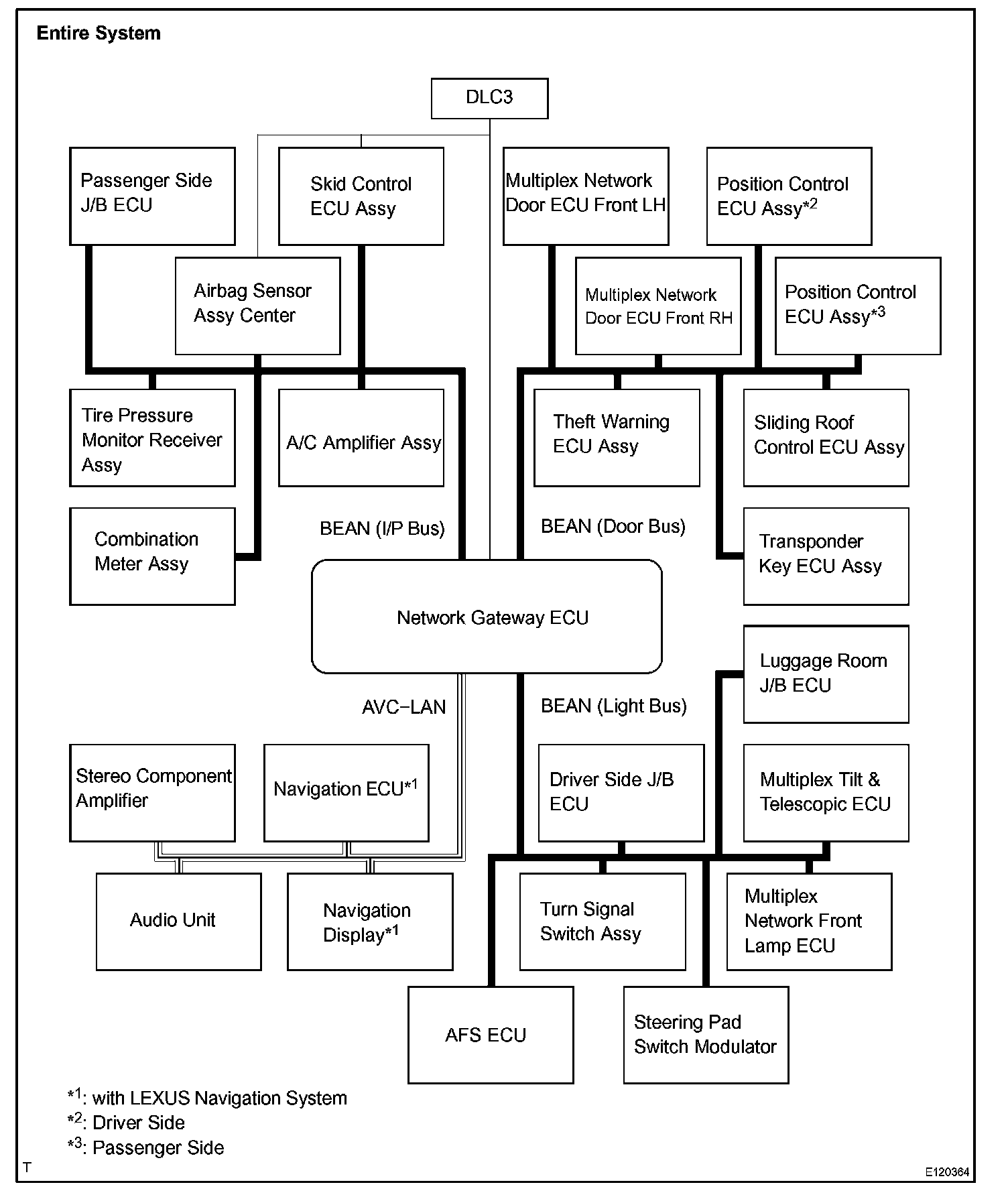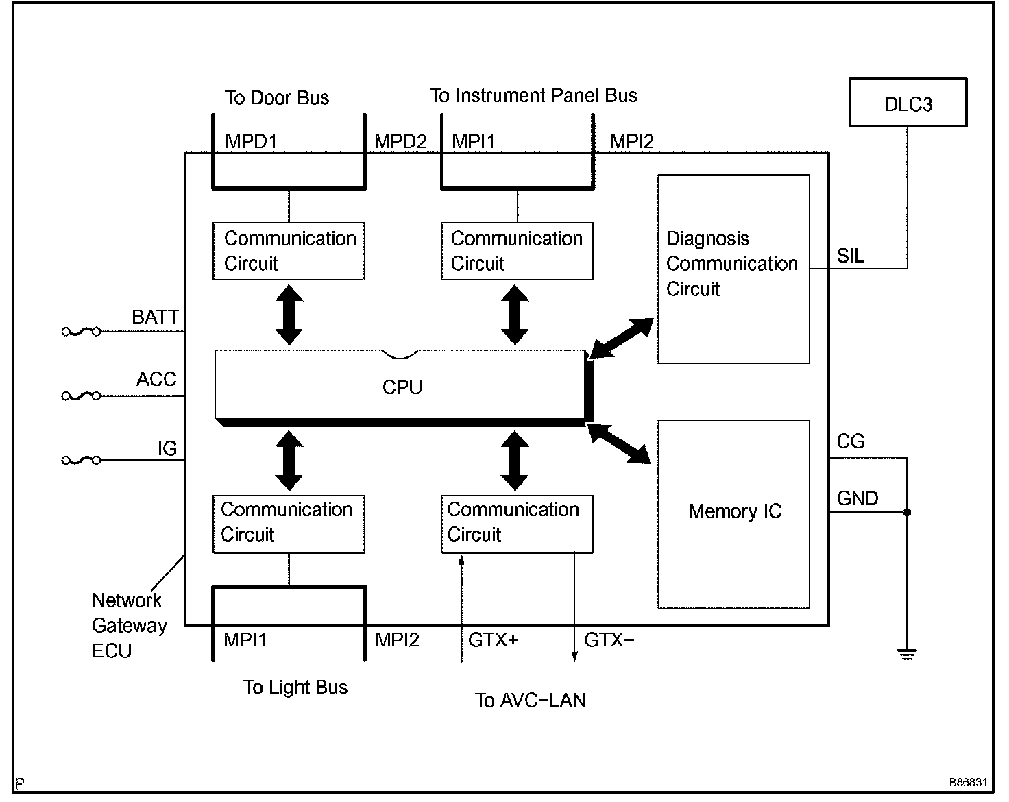 - The Gateway ECU connects the buses, AVC-LAN, and DLC3 (Data Link Connector 3), and manages the communication among them.