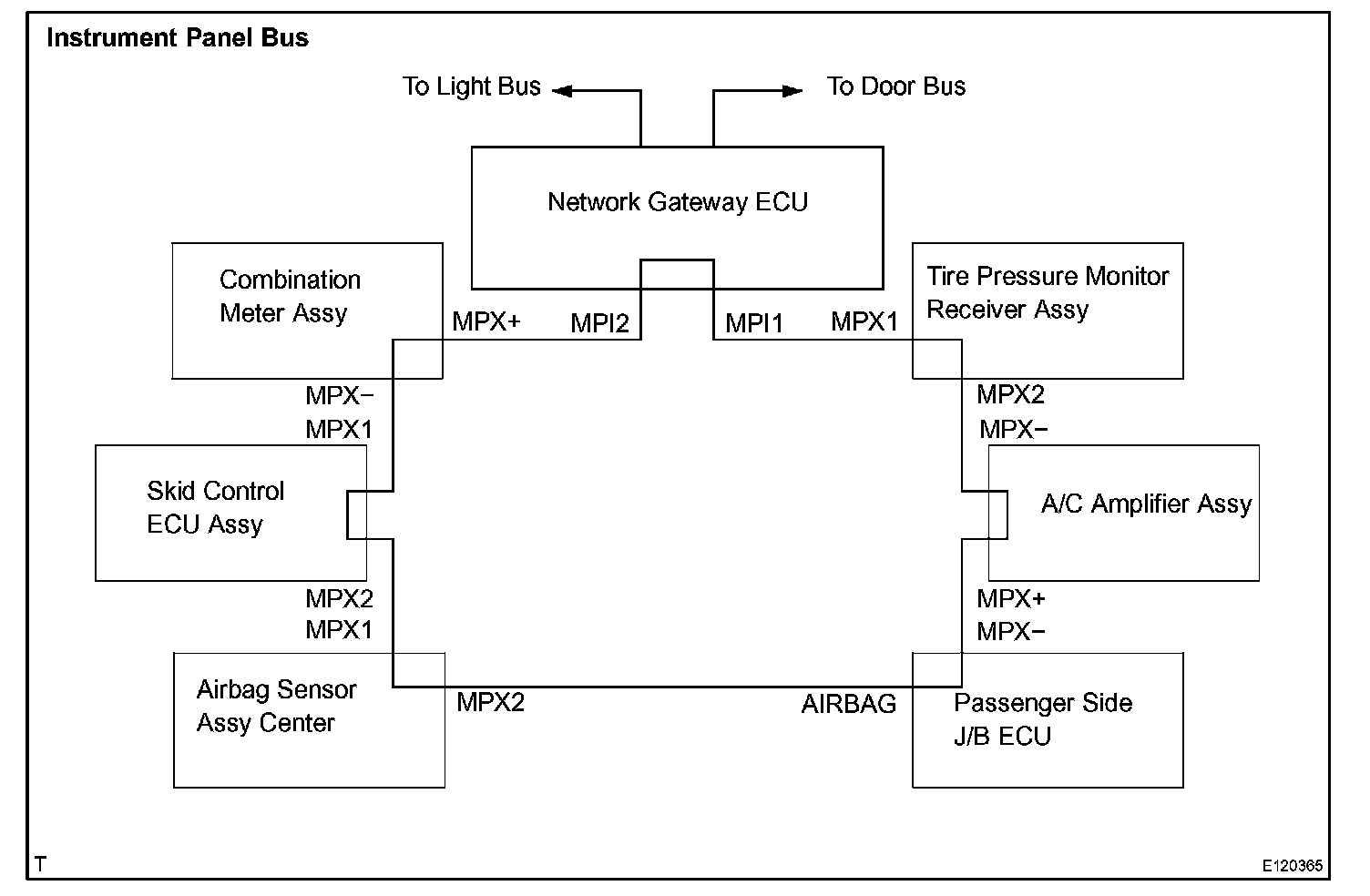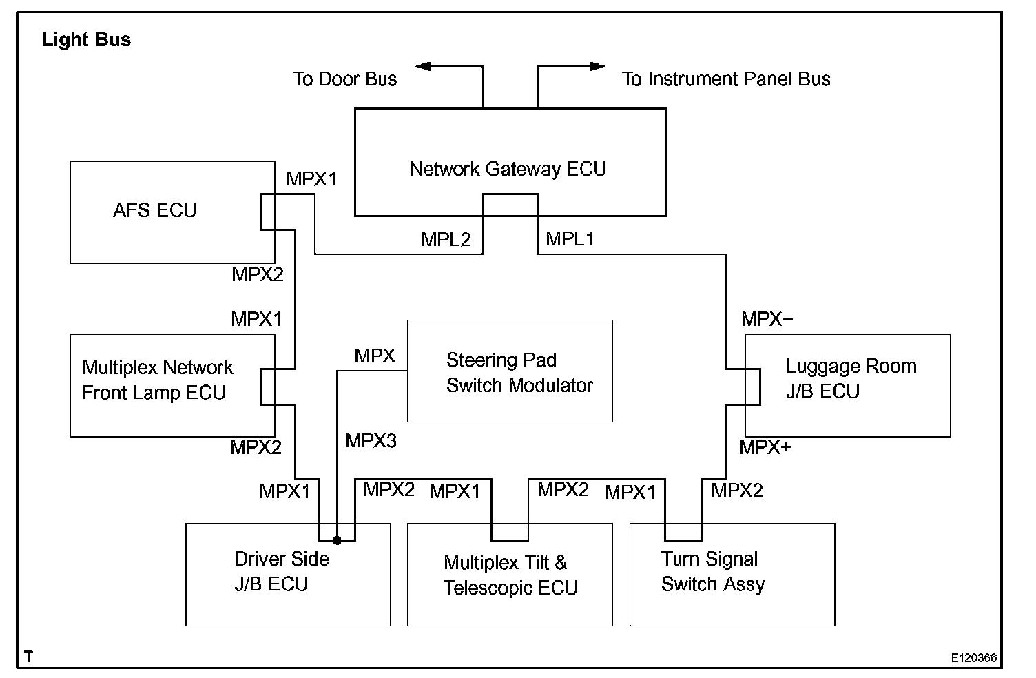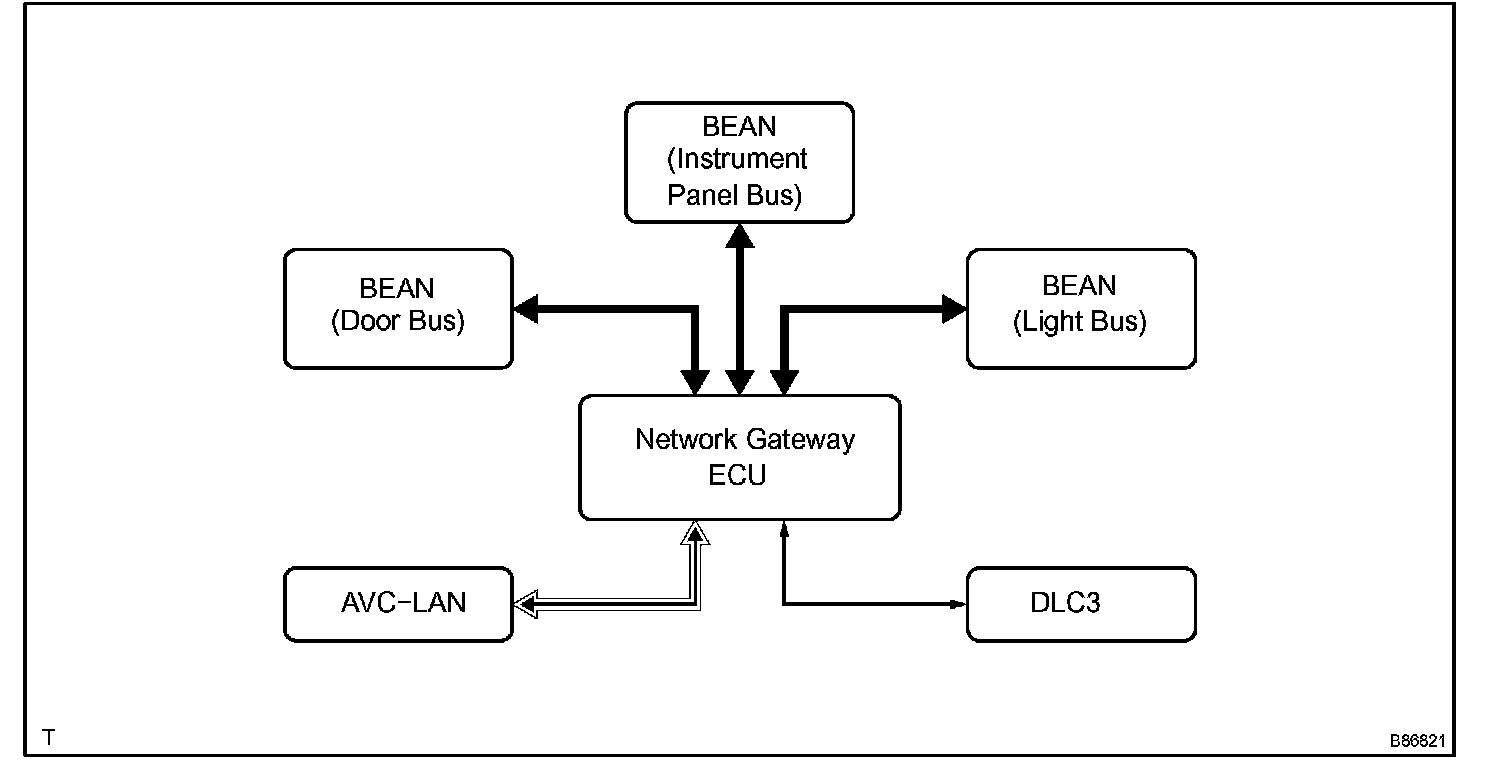 The network gateway ECU's function to relay the signals that are exchanged among the buses (Door Bus, Instrument Panel Bus, and Light Bus), the AVC-LAN, and the diagnosis system. It carries out an integrated management of these communication functions.
