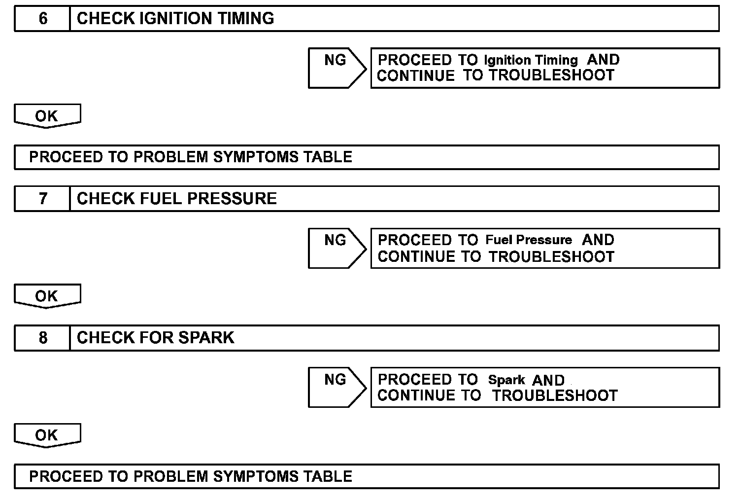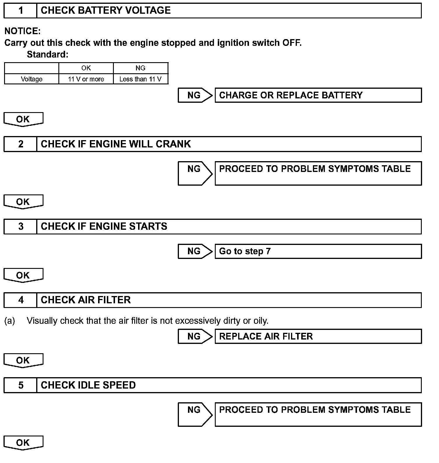 When the malfunction is not confirmed in the DTC check, troubleshooting should be carried out in all the possible circuits considered as causes of the problem. In many cases, by carrying out the basic engine check shown in the flowchart, the location causing the problem can be found quickly and efficiently. Therefore, using this check is essential in the engine troubleshooting.