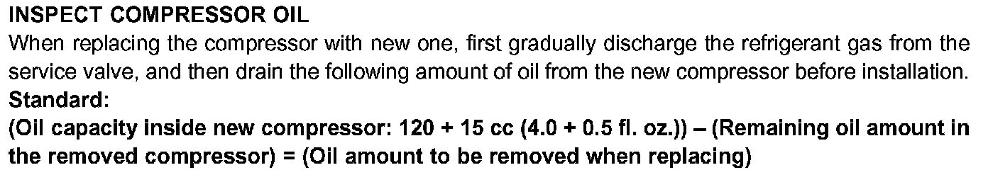 Lexus does not offer specifications for A/C system oil capacity. However, Lexus does provide the equation above for system refill upon compressor replacement.