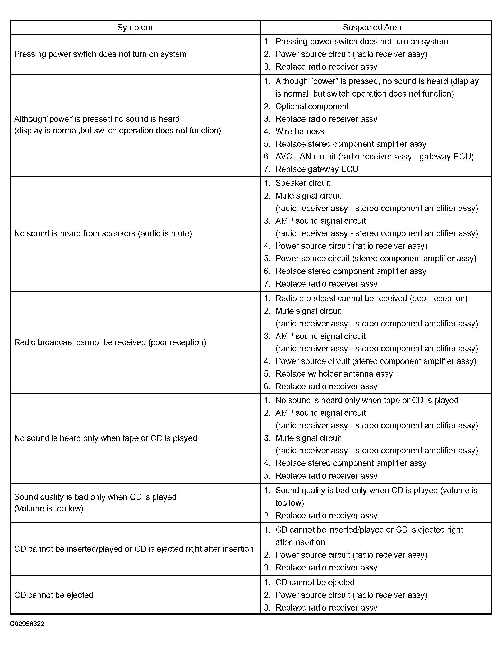 Use Fig 1 to help determine the cause of the problem symptom. The potential causes of the symptoms are listed in order of probability in the "Suspected Area" column of the table. Check each symptom by checking the suspected areas in the order they are listed. Replace parts as necessary.