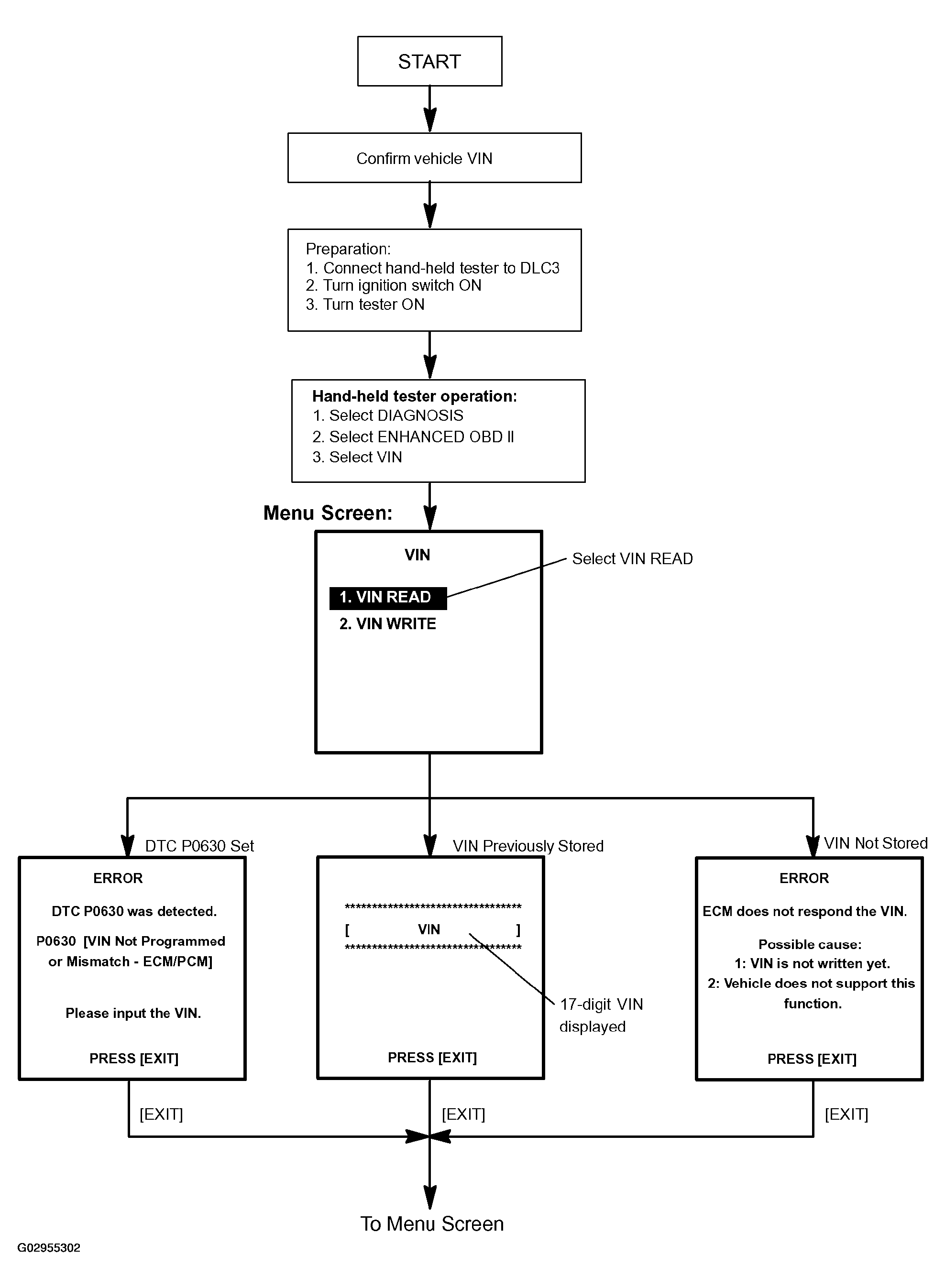 2. Read VIN: Explains the VIN reading process in Fig 1. This process allows the VIN stored in the ECM to be read, in order to confirm that the two VINs, provided with the vehicle and stored in the vehicle's ECM, are the same.