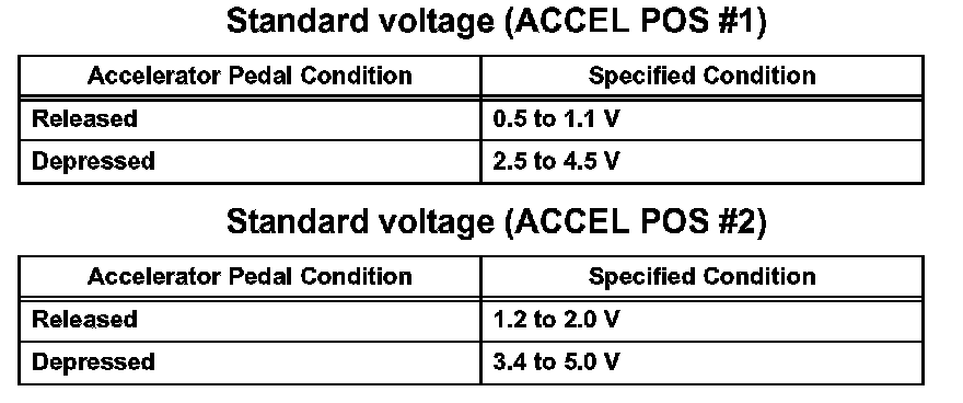 5. Operate the accelerator pedal, and then check that the ACCEL POS #1 and ACCEL POS #2 values are within the specifications.