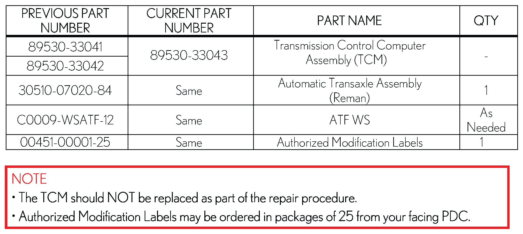 - TCM part number [Refer to the Parts Information section for the CURRENT PART NUMBER]