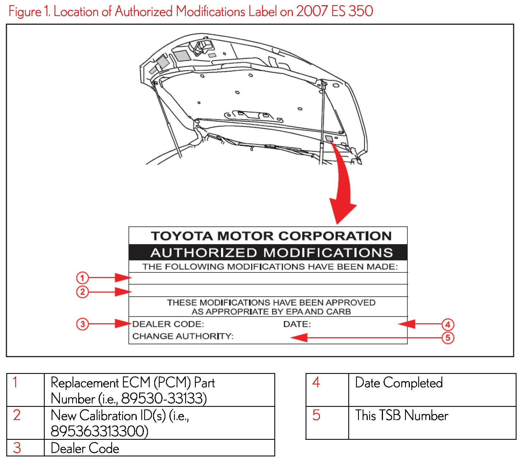 1. Check for the Authorized Modifications Label affixed to the vehicle in the location shown in Figure 1. Confirm if the TCM calibration has been updated. If the calibration ID listed is NOT the latest TCM calibration - go to step 2.