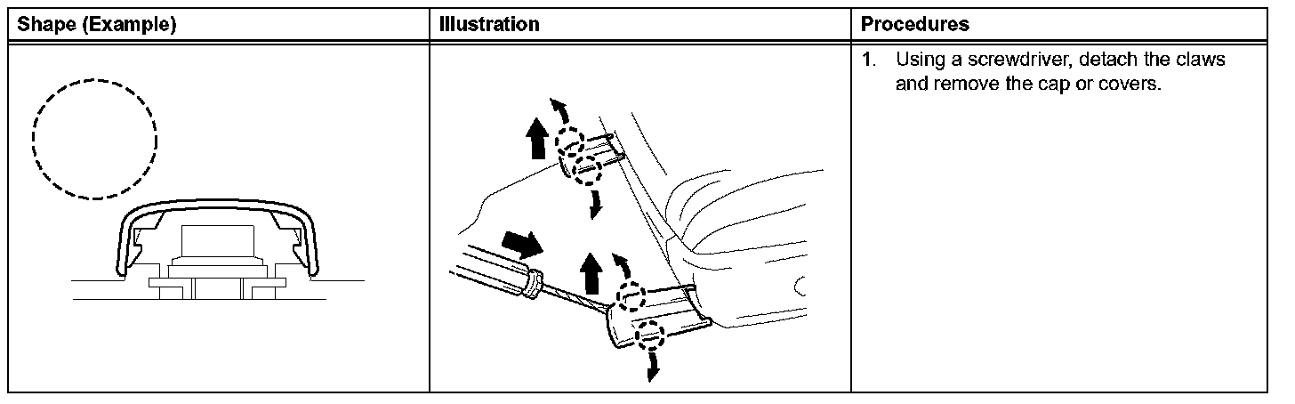 1. The removal and installation methods of typical claws used for vehicle body parts are shown in the table.