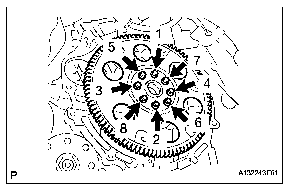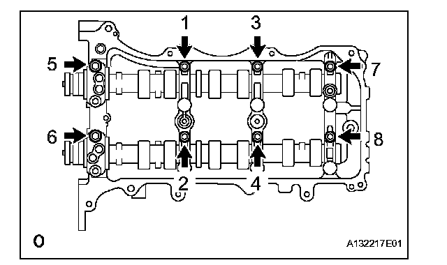 Temporarily tighten the 8 bolts in the order shown in the illustration.