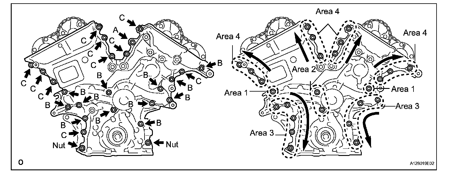 Fully tighten the bolts in this order: Area 1 and Area 2.