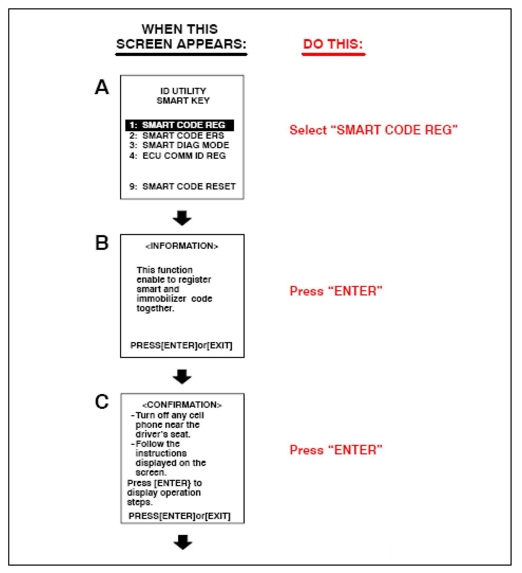 - After reset is complete, the ignition switch can only be cycled 10 times prior to key registration. If the ignition switch is cycled more than 10 times without key registration, the ID code box and Smart Key (Certification) ECU will be locked and will require replacement.