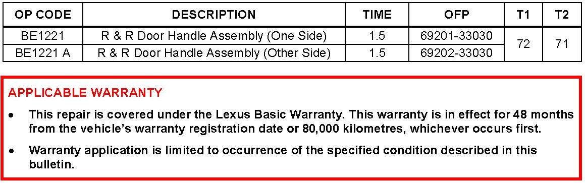 1. Replace front door handle frame and outside handle in affected door Refer to the ETAS/TIS library, applicable model and model year Repair Manual: