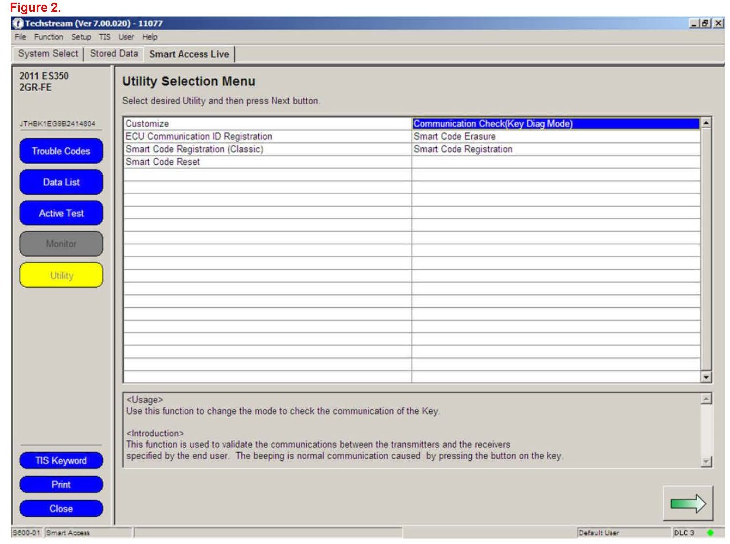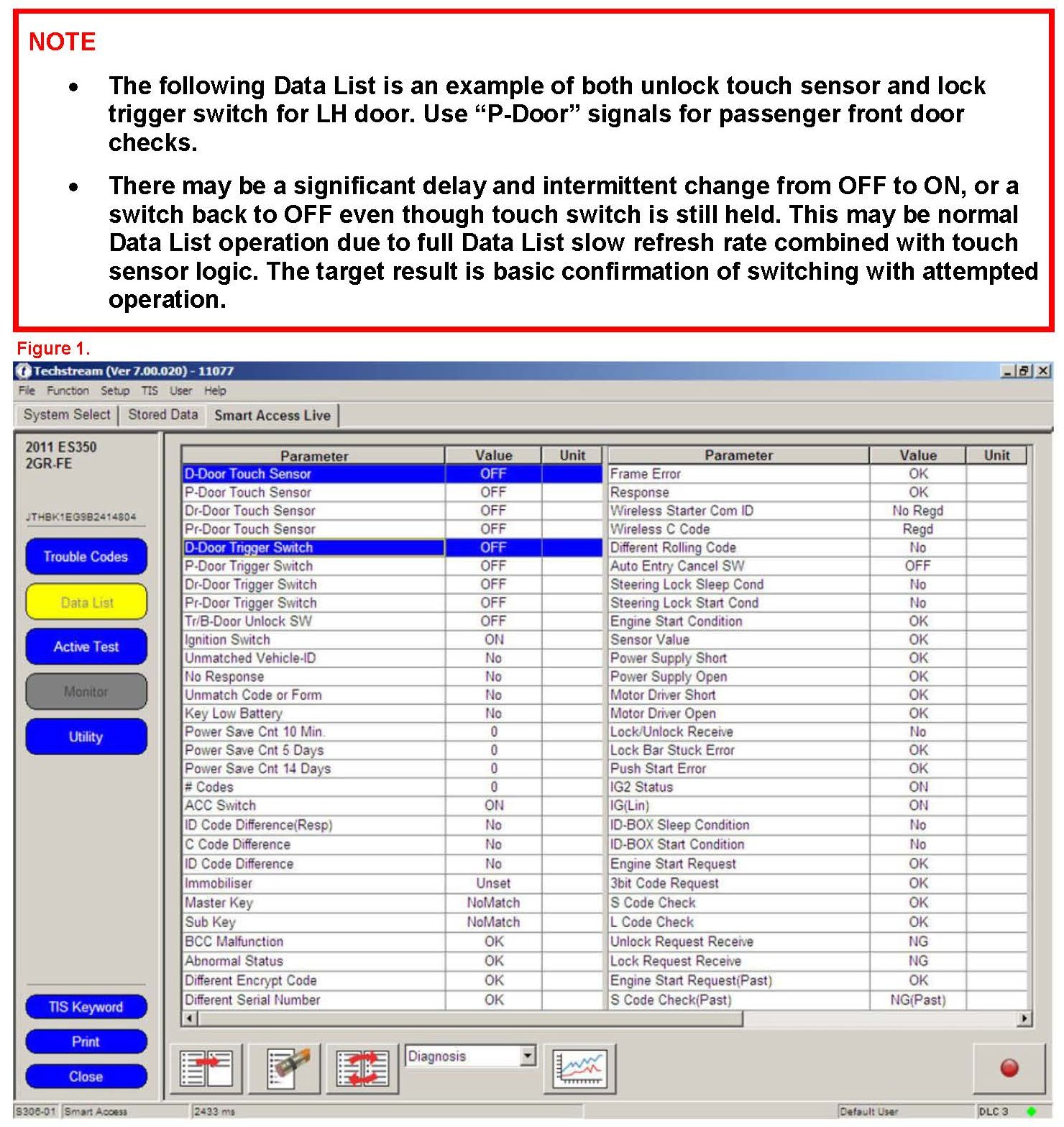 2. Once the specific malfunction is confirmed, use Techstream Smart Key Data List to review the corresponding signa from the left or right door as illustrated in Figure 1.