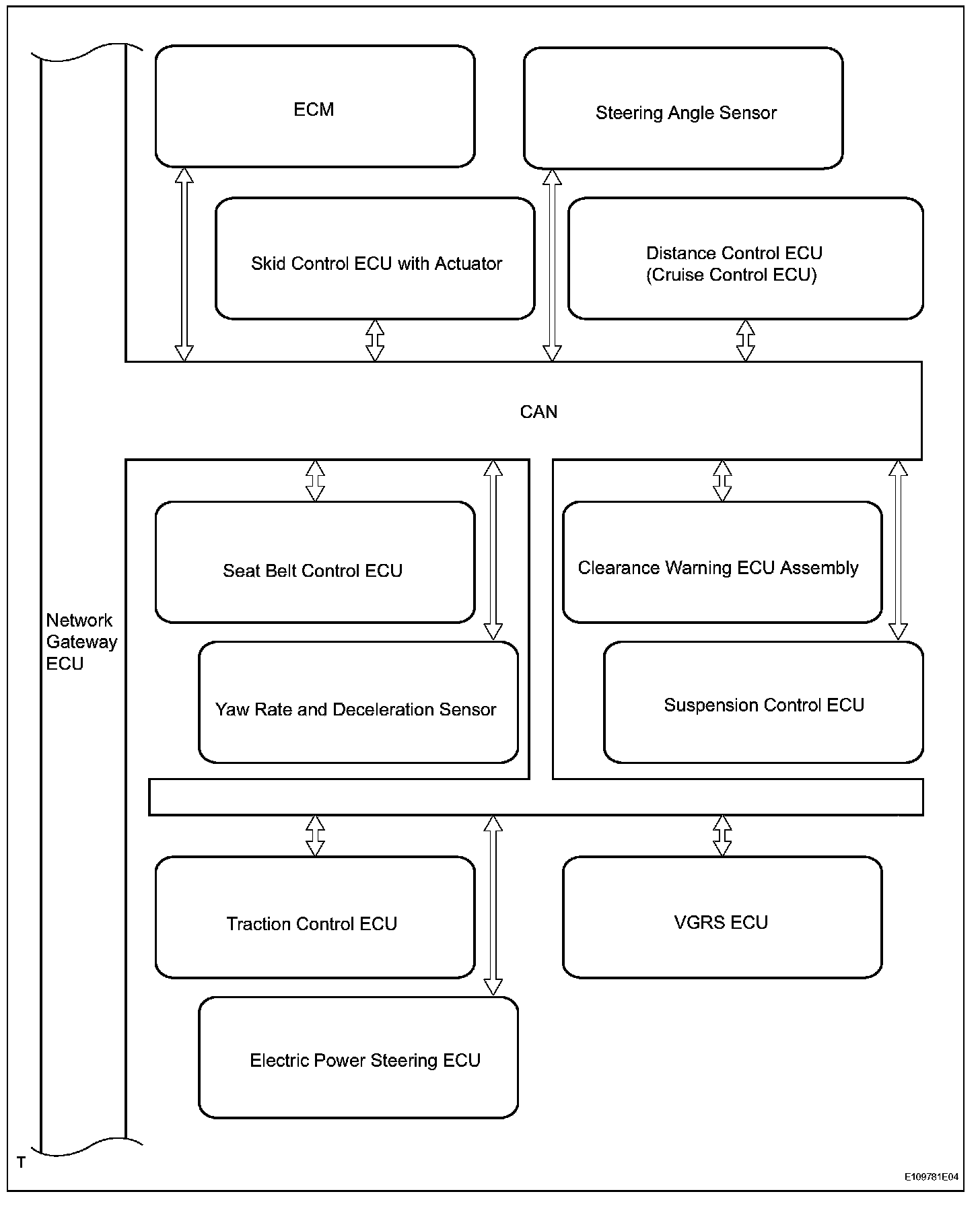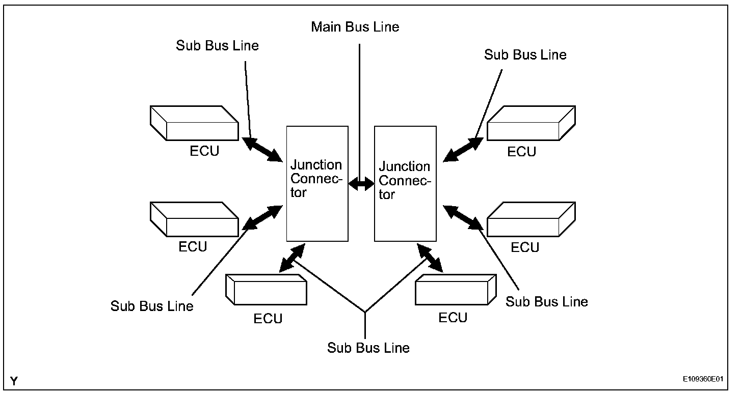 2. CAN communication uses the bus style network to connect ECUs. This network consists of a main bus line (comprising junction connectors and a sub bus line (comprising ECUs that are connected to the main bus line). This style enables communication among all the connected ECUs.