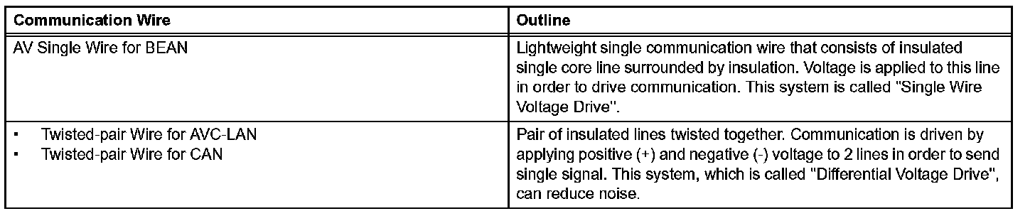2. A single, Automobile Vinyl (AV) wire is used for BEAN communication. A twisted-pair wire is used for CAN and AVC-LAN communication.