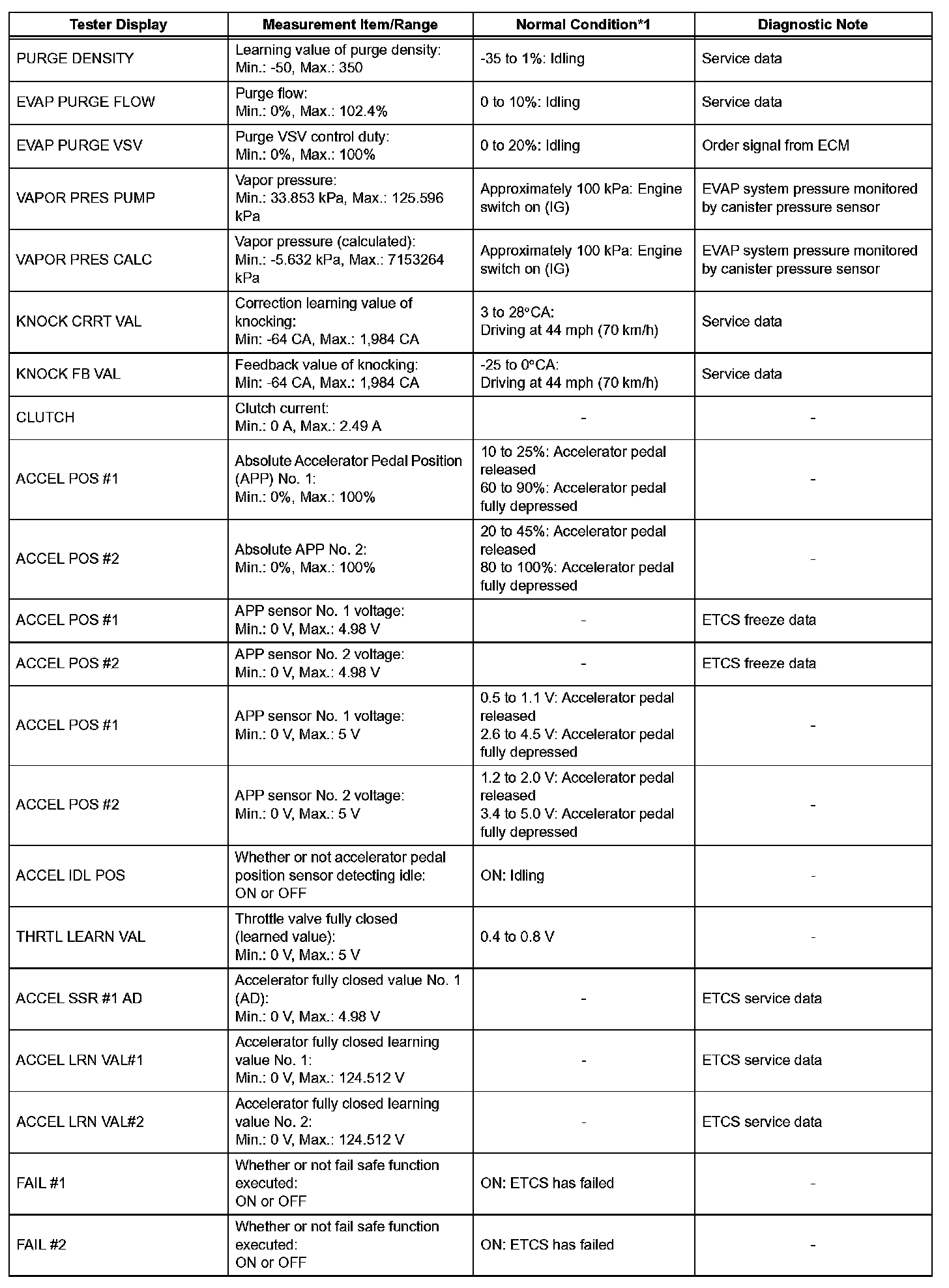 NOTE: In the table given, the values listed under Normal Condition are reference only. Do not depend solely on these values when determining whether or not a part is faulty.