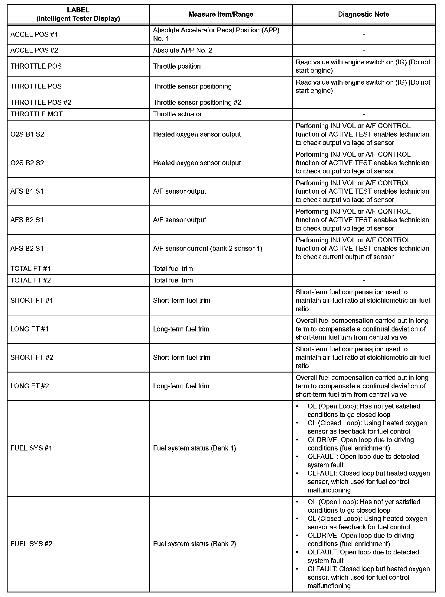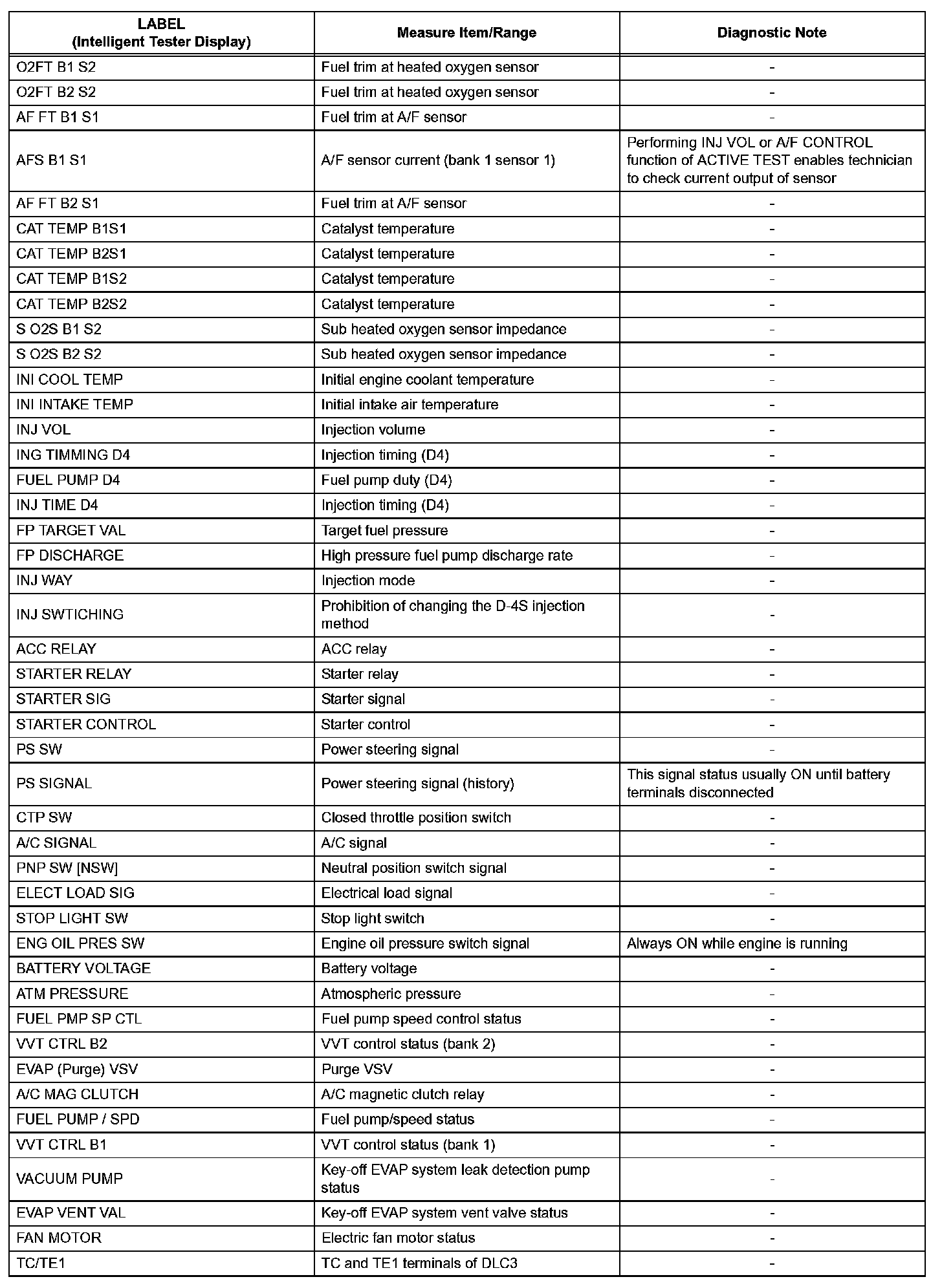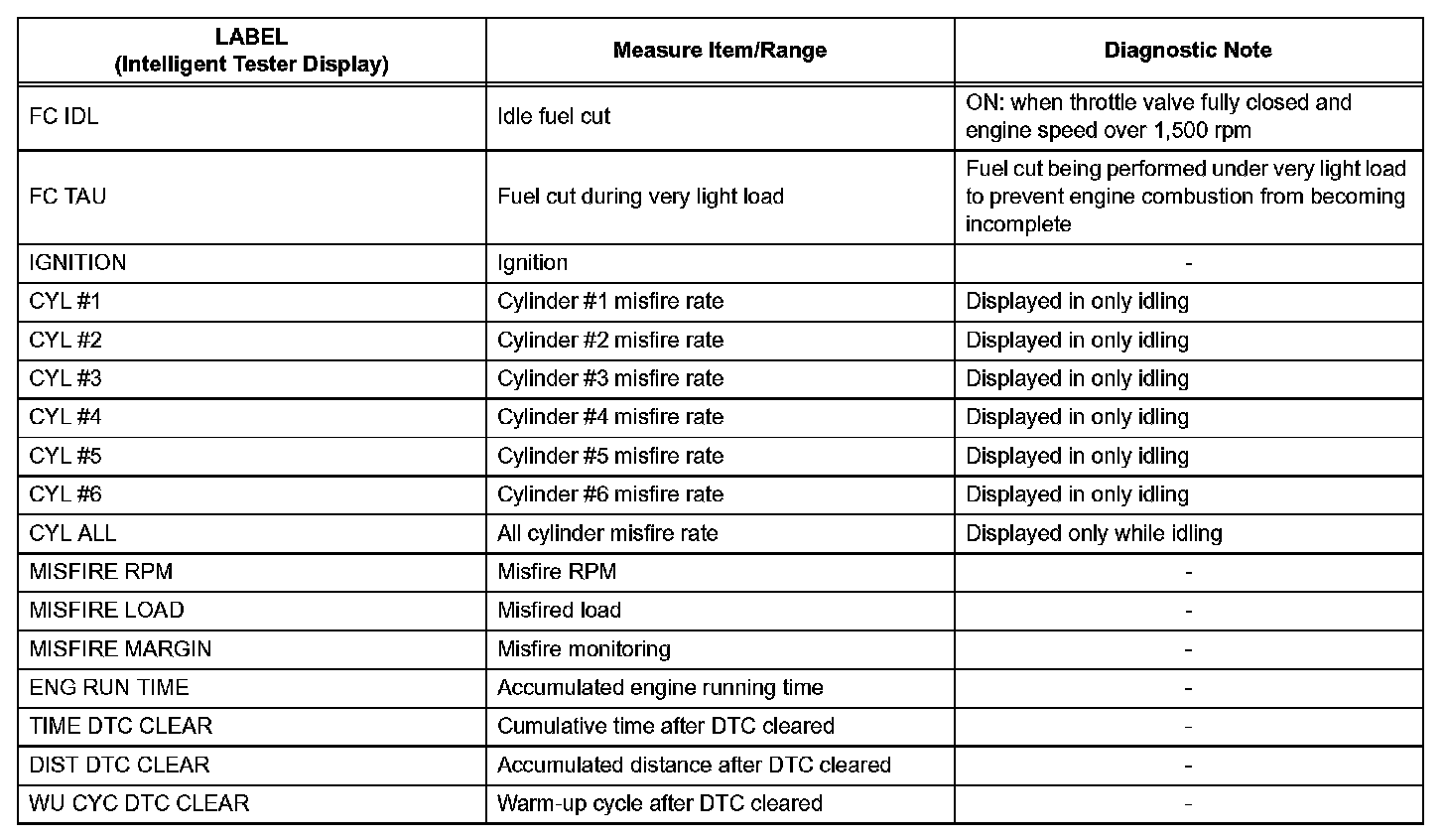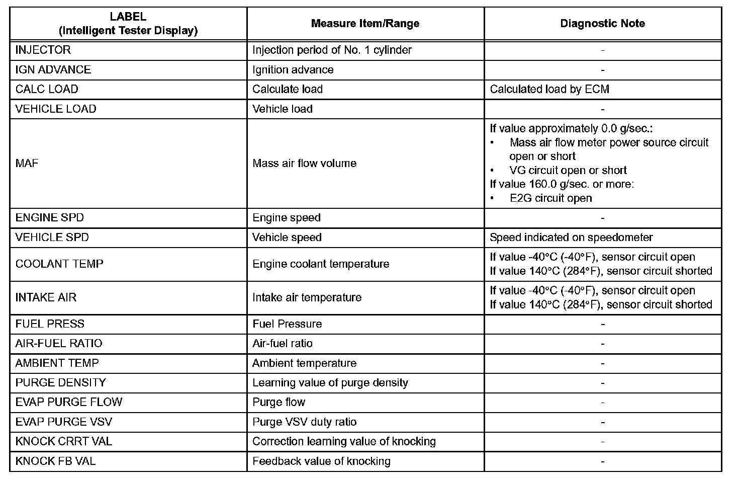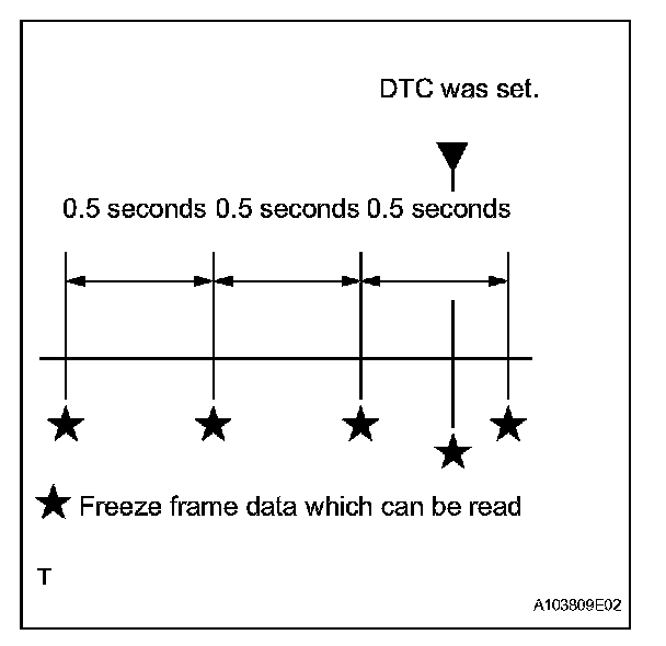 The ECM records vehicle and driving condition information as freeze frame data the moment a DTC is stored. When troubleshooting, freeze frame data can be helpful in determining whether the vehicle was running or stopped, whether the engine was warmed up or not, whether the air-fuel ratio was lean or rich, as well as other data recorded at the time of a malfunction.