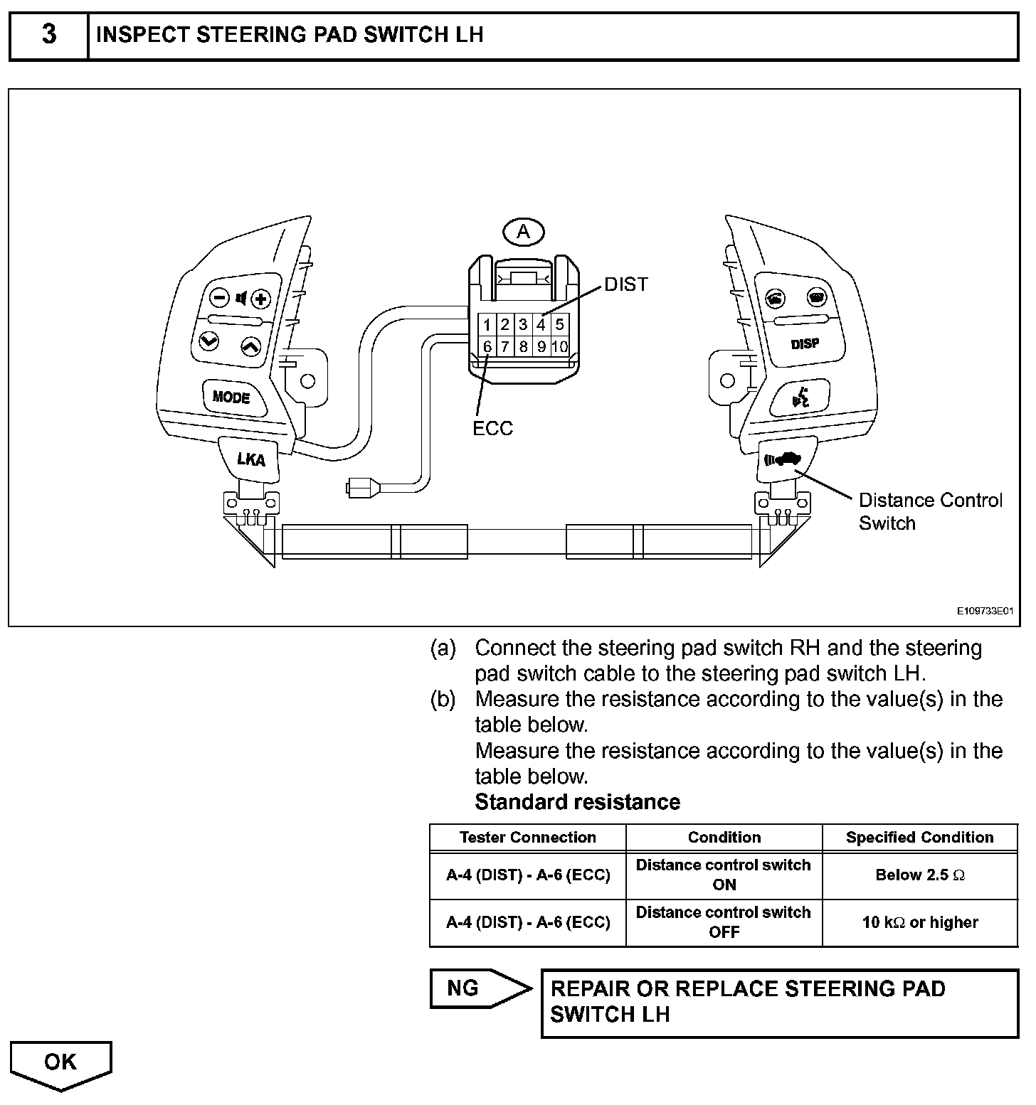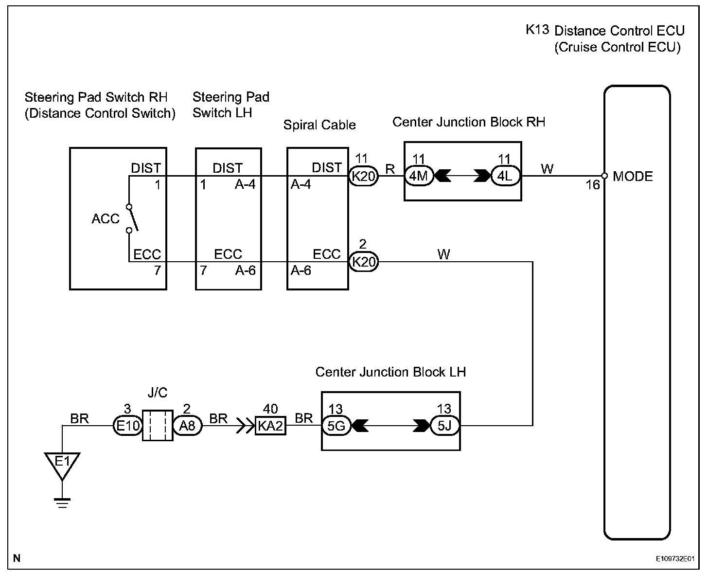 The distance control switch sets the vehicle-to-vehicle distance mode. The distance control switch is installed in the steering pad switch. The vehicle-to-vehicle distance set value can be changed by operating the steering pad switch (distance control switch) while the dynamic radar cruise control system is in operation. The steering pad switch uses the BEAN to communicate with each ECU. Therefore it does not have a direct connection with the ECM. If there are any malfunction in the communication line of the steering pad switch, one or more DTCs in the multiplex communication system are output.