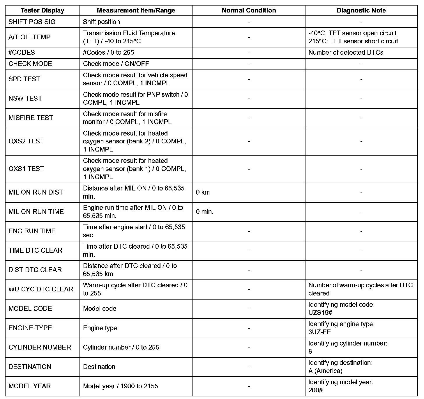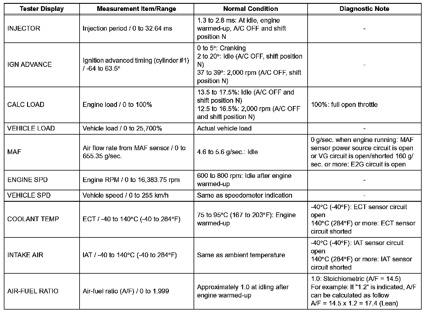 DATA LISTHINT: Using the intelligent tester's DATA LIST allows switch, sensor, actuator and other item values to be read without removing any parts. Reading the DATA LIST early in troubleshooting is one way to save time.